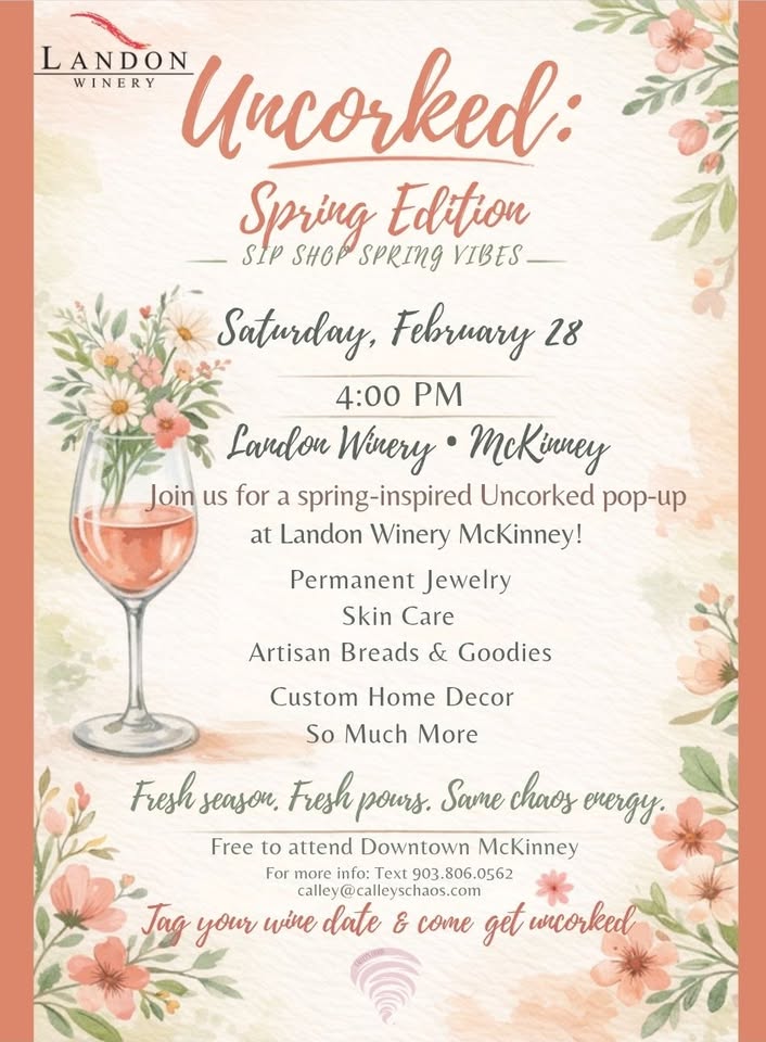 Join us for Uncorked: Spring Edition at Landon Winery – McKinney for an afternoon of sipping, shopping, and spring vibes.