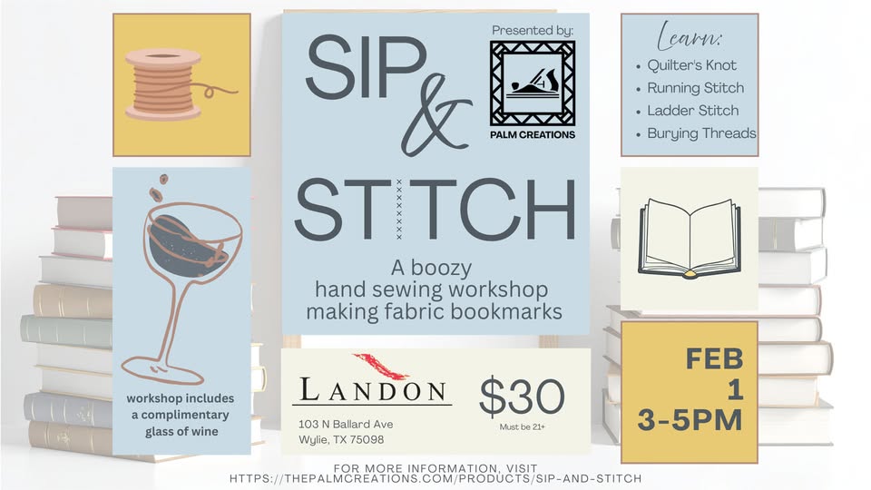 At every Sip & Stitch workshop you will gain knowledge and experience in hand sewing--learning some of the most common hand sewing techniques, such as the quilter's knot, a running stitch, a ladder stitch, and burying threads. You will also receive a complimentary glass of wine.