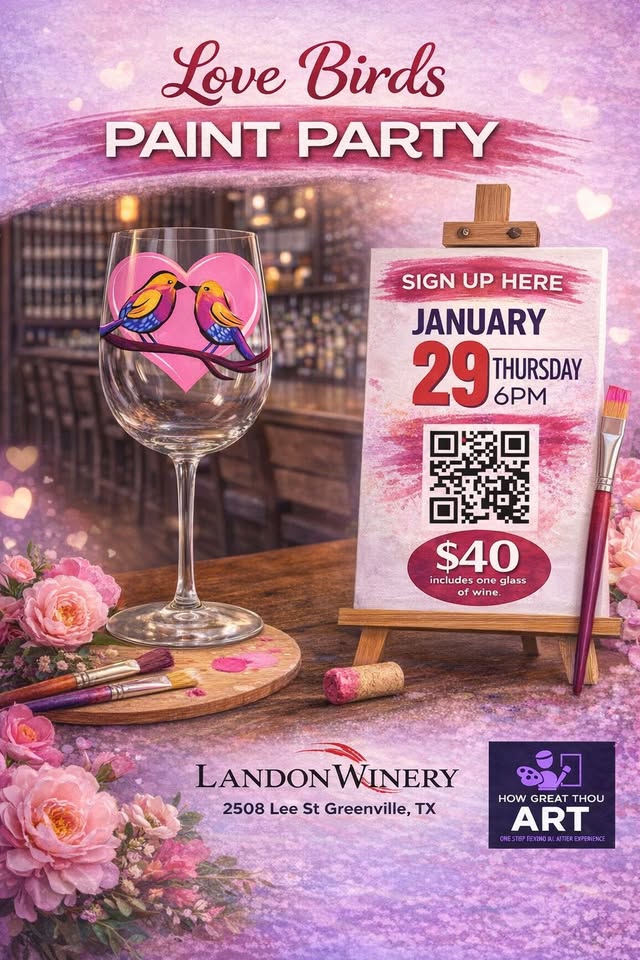 Join us for a creative and fun-filled Love Birds Paint Party on Thursday, January 29th at 6:00 PM at Landon Winery in Greenville! This special event features painting an adorable Love Birds design on a wine glass—perfect for couples, friends, or a cozy night out.