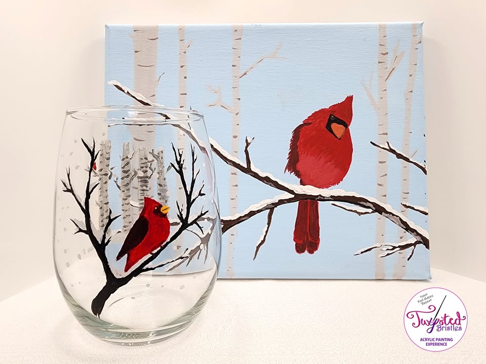 Paint this beautiful design on a canvas or a stemless glass, Or you may opt to paint both! Featuring a bright red cardinal in a lovely winter scene. The glass presents a cardinal in a tree on the front, with aspen trees on the back side for a 3-D effect.